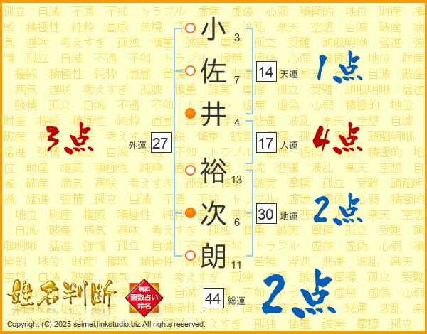 小(3画)佐(7画)井(4画) 裕(13画)次(6画)朗(11画)
