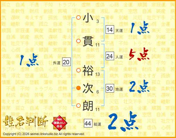 小貫裕次朗さんの総運は44画の2点!
