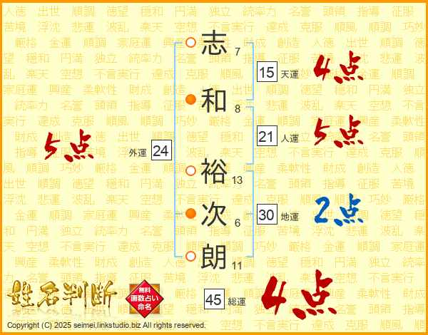 志(7画)和(8画) 裕(13画)次(6画)朗(11画)