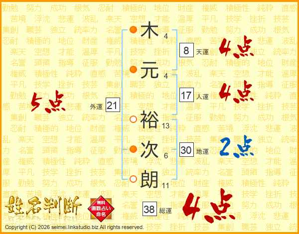 木(4画)元(4画) 裕(13画)次(6画)朗(11画)
