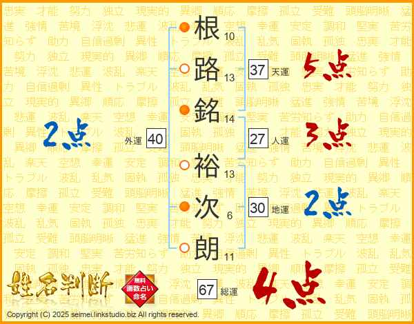 根(10画)路(13画)銘(14画) 裕(13画)次(6画)朗(11画)