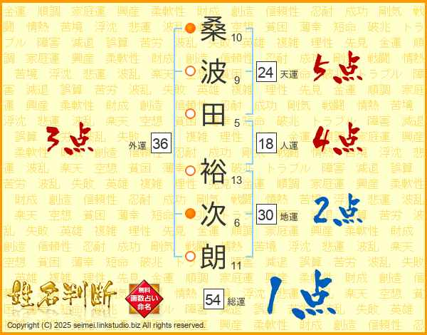 桑(10画)波(9画)田(5画) 裕(13画)次(6画)朗(11画)