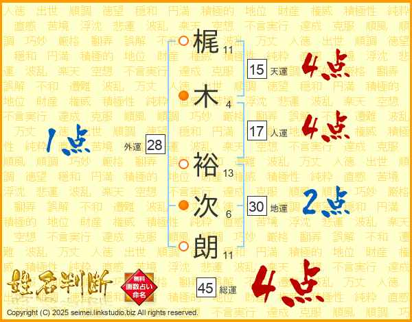 梶(11画)木(4画) 裕(13画)次(6画)朗(11画)