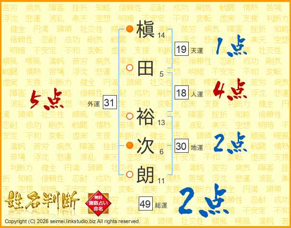 槇(14画)田(5画) 裕(13画)次(6画)朗(11画)