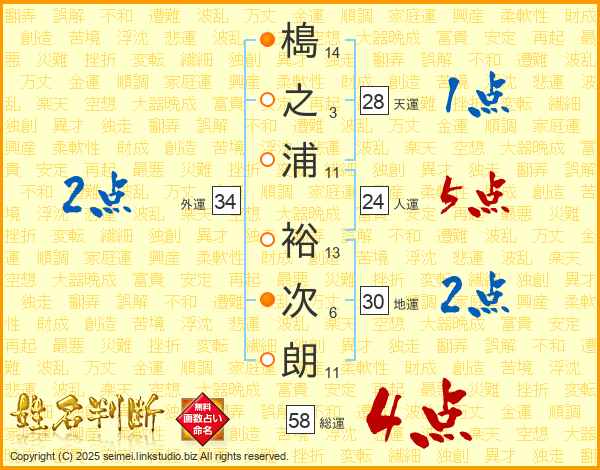 槝之浦裕次朗さんの総運は58画の4点!