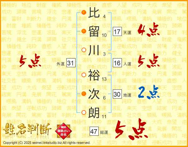 比(4画)留(10画)川(3画) 裕(13画)次(6画)朗(11画)