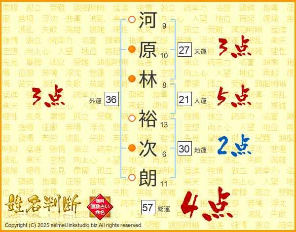 河(9画)原(10画)林(8画) 裕(13画)次(6画)朗(11画)