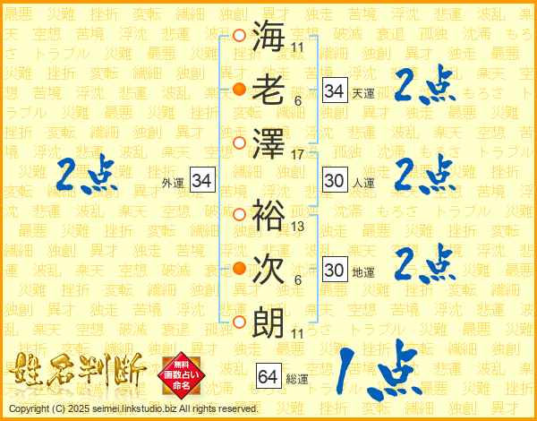 海(11画)老(6画)澤(17画) 裕(13画)次(6画)朗(11画)