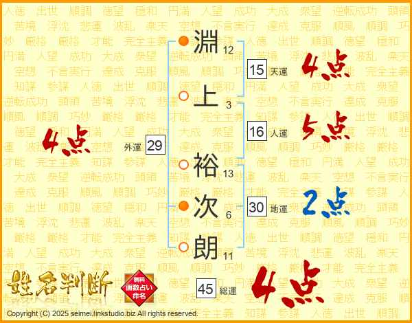 淵(12画)上(3画) 裕(13画)次(6画)朗(11画)