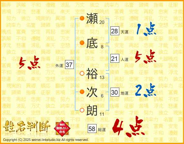 瀬(20画)底(8画) 裕(13画)次(6画)朗(11画)