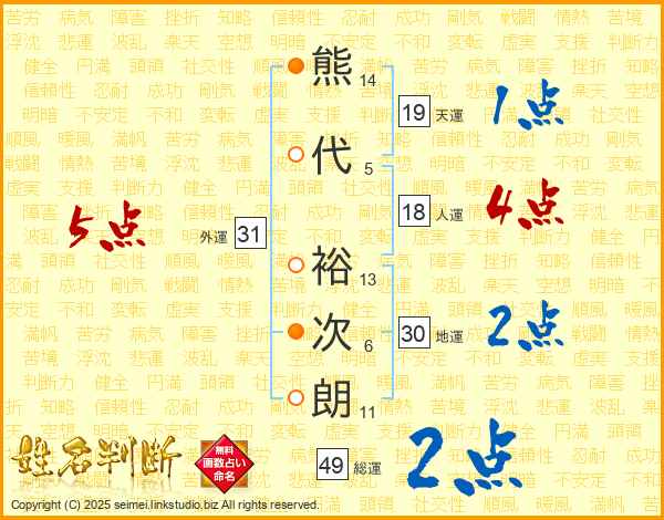 熊(14画)代(5画) 裕(13画)次(6画)朗(11画)