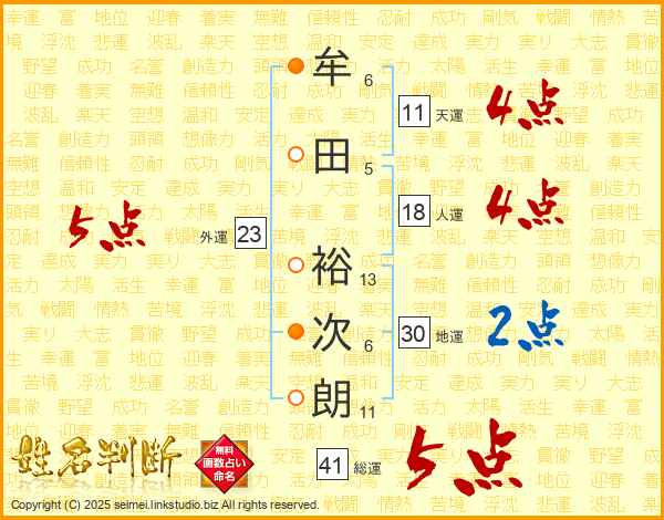 牟田裕次朗さんの総運は41画の5点!