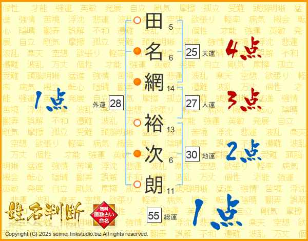 田(5画)名(6画)網(14画) 裕(13画)次(6画)朗(11画)
