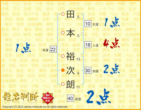 田(5画)本(5画) 裕(13画)次(6画)朗(11画)