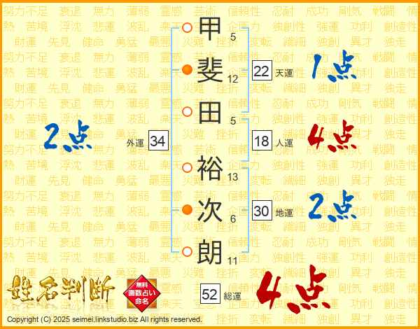甲(5画)斐(12画)田(5画) 裕(13画)次(6画)朗(11画)