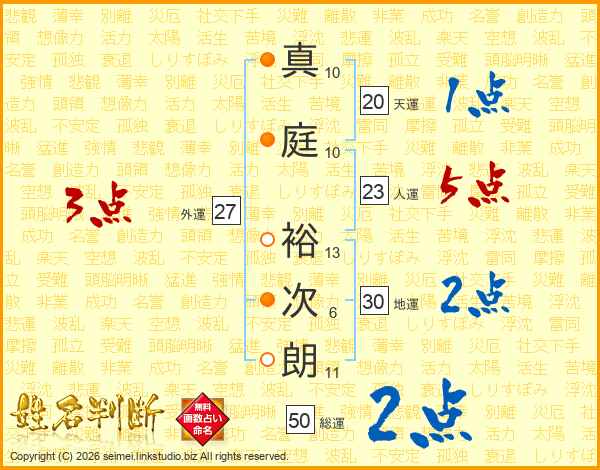 真(10画)庭(10画) 裕(13画)次(6画)朗(11画)