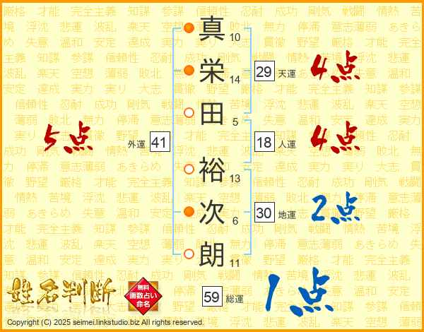 真(10画)栄(14画)田(5画) 裕(13画)次(6画)朗(11画)