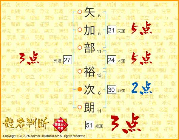矢(5画)加(5画)部(11画) 裕(13画)次(6画)朗(11画)