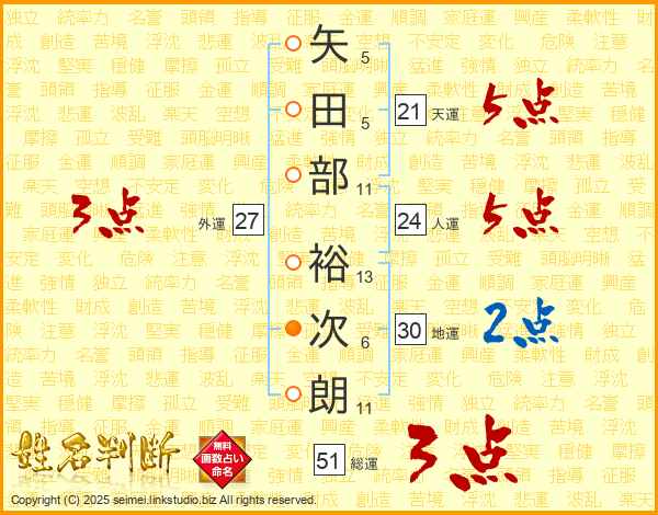 矢(5画)田(5画)部(11画) 裕(13画)次(6画)朗(11画)