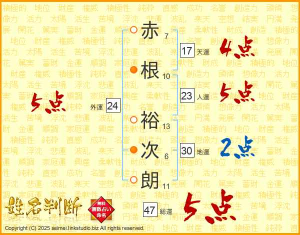 赤(7画)根(10画) 裕(13画)次(6画)朗(11画)