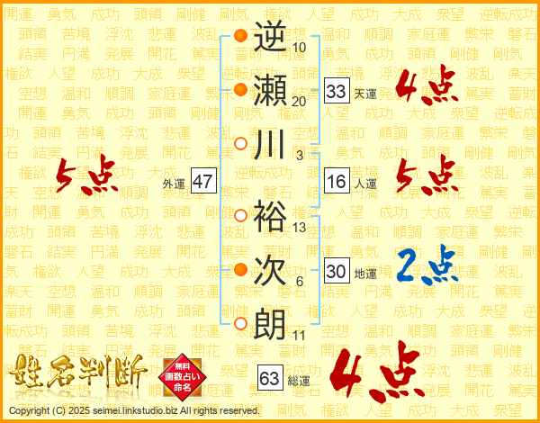 逆(10画)瀬(20画)川(3画) 裕(13画)次(6画)朗(11画)