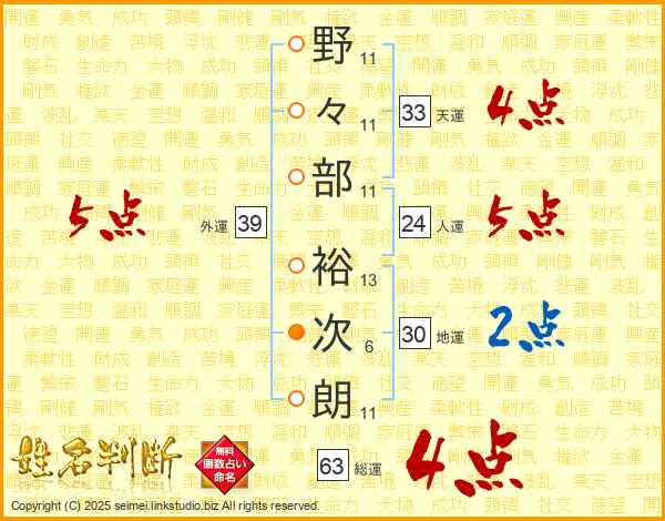 野(11画)々(11画)部(11画) 裕(13画)次(6画)朗(11画)