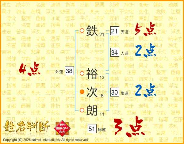 鉄(21画) 裕(13画)次(6画)朗(11画)