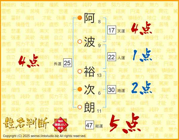 阿(8画)波(9画) 裕(13画)次(6画)朗(11画)