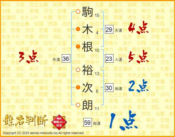 駒(15画)木(4画)根(10画) 裕(13画)次(6画)朗(11画)