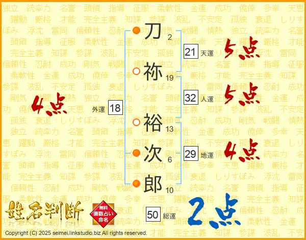 刀(2画)祢(19画) 裕(13画)次(6画)郎(10画)