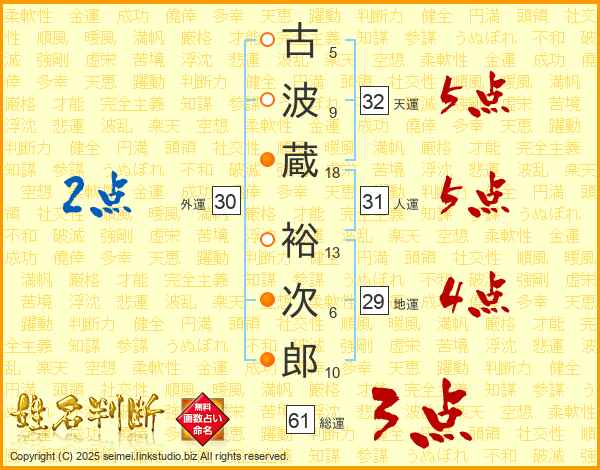 古(5画)波(9画)蔵(18画) 裕(13画)次(6画)郎(10画)