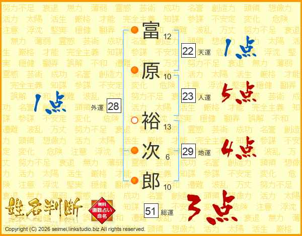 富原裕次郎さんの総運は51画の3点!
