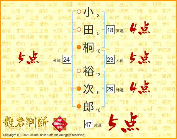 小(3画)田(5画)桐(10画) 裕(13画)次(6画)郎(10画)