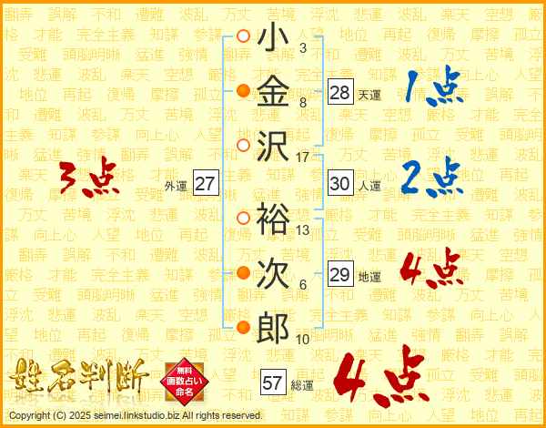 小(3画)金(8画)沢(17画) 裕(13画)次(6画)郎(10画)