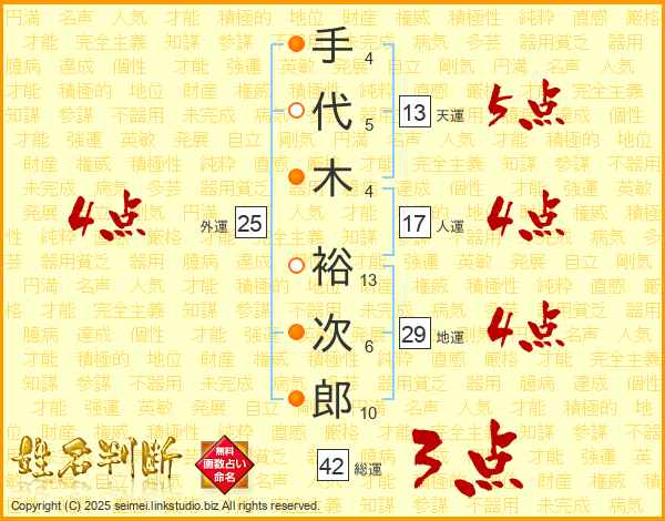 手(4画)代(5画)木(4画) 裕(13画)次(6画)郎(10画)