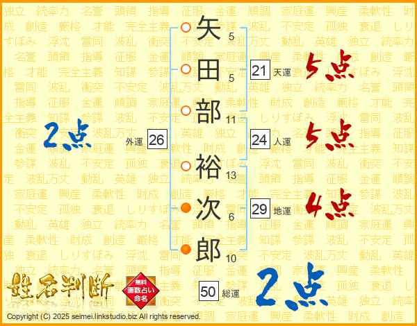 矢(5画)田(5画)部(11画) 裕(13画)次(6画)郎(10画)