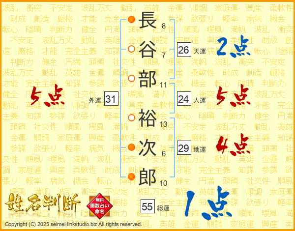 長(8画)谷(7画)部(11画) 裕(13画)次(6画)郎(10画)