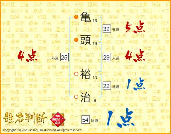 亀(16画)頭(16画) 裕(13画)治(9画)