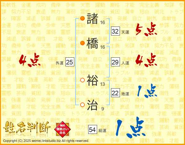 諸(16画)橋(16画) 裕(13画)治(9画)