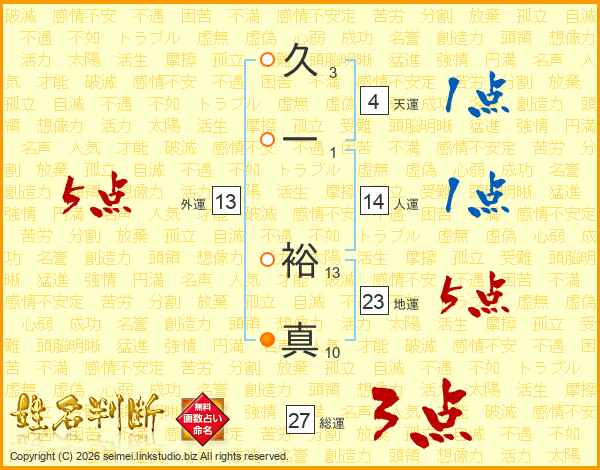 あなたの人生を表す1番重要な運勢です。生涯を通じて影響する総合運となり、主に50歳以降の晩年期に影響を及ぼします。苗字と名前の合計画数。