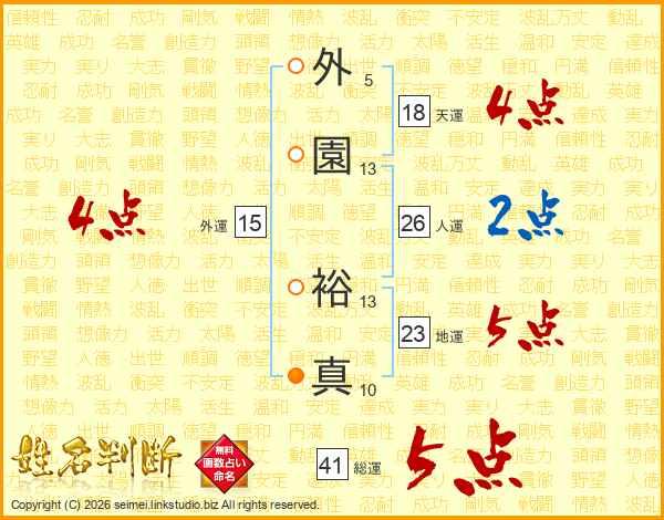 生活面を象徴する運勢です。外部から受ける影響力を表し、結婚運、家庭運や職場、環境への順応性を表します。総運から人運を引いた画数。姓や名が1文字の場合を除く。