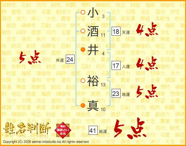 小酒井裕真さんの総運は41画の5点!