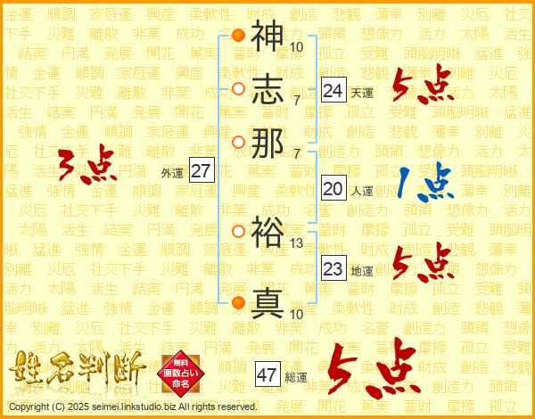 神(10画)志(7画)那(7画) 裕(13画)真(10画)