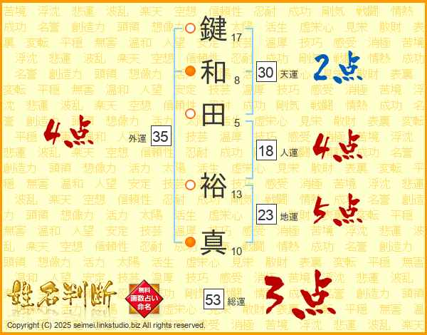 鍵(17画)和(8画)田(5画) 裕(13画)真(10画)