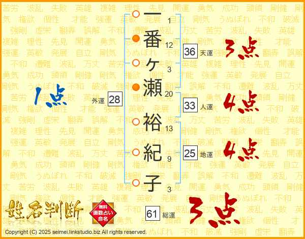 一番ヶ瀬裕紀子さんの総運は61画の3点!