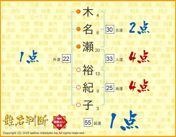 木(4画)名(6画)瀬(20画) 裕(13画)紀(9画)子(3画)