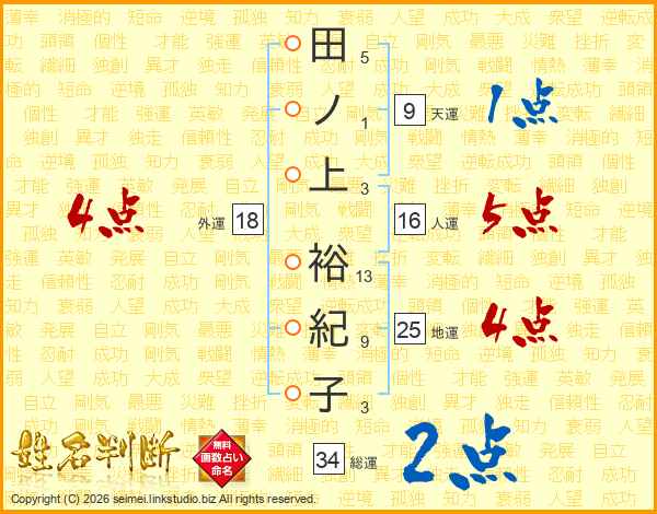 田(5画)ノ(1画)上(3画) 裕(13画)紀(9画)子(3画)