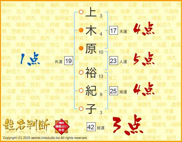 上(3画)木(4画)原(10画) 裕(13画)紀(9画)子(3画)