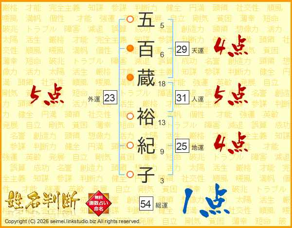 五(5画)百(6画)蔵(18画) 裕(13画)紀(9画)子(3画)