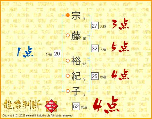 宗藤裕紀子さんの総運は52画の4点!